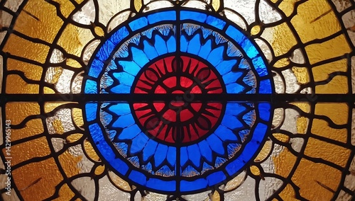 stained-glass, window, circle, blue, red, gold, yellow, pattern, design, decorative, art, architecture, light, colours, glasses, traditional, detail, craftsmanship, historic