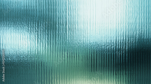 Stained metal premium rib acrylic glass sheet. Fluted door blue green blurred overlay. Wavy stripes refraction, frosted surface pattern. Embossed vertical and horizontal striped transfluent material.