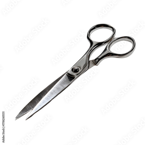 Stainless steel scissors open, blade reflections and texture realism, cinematic studio light and shadow balance, white isolated background