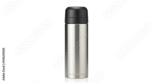 Stainless steel thermal bottle with black lid, realistic reflections. Isolated on transparent background.
