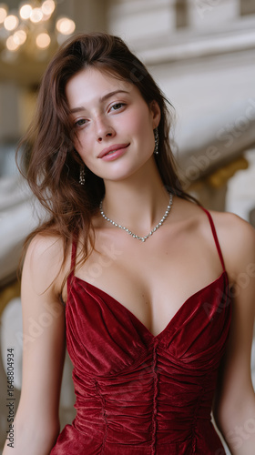 woman, portrait, red, satin, dress, fashion, model, beauty, elegant, stylish, chic, glamour, female, indoor, staircase, warm, light, bokeh, neckline, refined, posh, polished, luxury, formal, editorial, vertical, premium, commercial, high, resolution