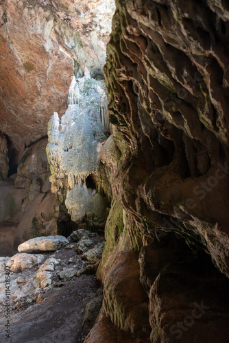Stalactites and stalagmites in the Murciélago Cave in the Sierra Calderona of Altura