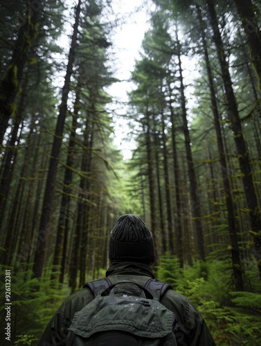 Standing amidst the trees, embracing the tranquil and calming essence of nature's beauty enveloped by the grandeur of towering forests.