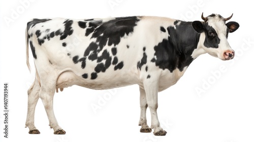 cow, standing, half face, cattle, animal, mammal, farm animal, farm animal, black, white, spotted, horn, hoof, udder, isolated, cut-out, studio shot, full body, agriculture, farming, dairy, milk, rural, countryside, domesticated, ungulate, herbivore, looking, farm