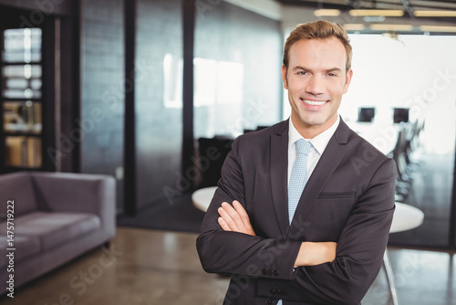 Standing middle-aged man wearing black suit crossing arms in open-plan office, glass partitions