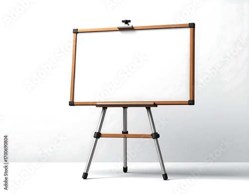Standing whiteboard with wooden frame and metal legs on a blank background