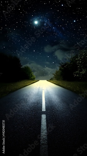 road, night, star, sky, moon, landscape, travel, journey, adventure, direction, future, hope, light, path, destination, freedom, traveler, driving, car, automobile, vehicle, open road, countryside, nature, forest, tree, grass, asphalt, pavement, illuminated, dark, calm, peaceful, silent, empty, lonely, cosmic, astronomy, universe, space, galaxy, cosmos, voyage, exploring, escape, dream, motivation, inspiration