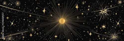 Starry night with golden sunburst and black background creating a cosmic atmosphere