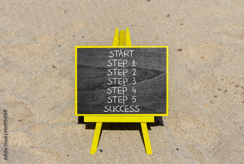Start and step to success symbol. Concept word Start step 1 2 3 4 5 Success on beautiful black blackboard on beautiful sand background. Business start and step to success concept. Copy space.