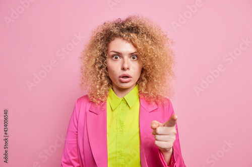 Startled emotional curly haired woman stands speechless points in front sees amazing offer dressed in bright shirt and jacket isolated over pink background gasps from wonder. Just look there