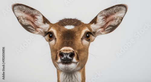 Startled wild deer close up highlighting expressive eyes and ears on a plain white backdrop