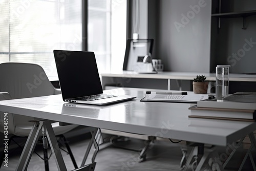 startup firm desk, a laptop with a blank screen, an empty office, a space in a marketer's office, a desk with office supplies, and a window desk. Ideas for placing an office desk. Generative AI