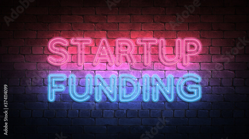 Startup Funding neon sign. purple and blue glow. neon text. Brick wall lit by neon lamps. Night lighting on the wall. 3d illustration.