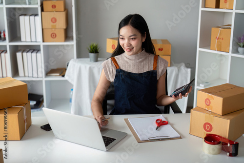 Startup small business entrepreneur of freelance Asian woman using laptop and box to receive and review order online to prepare to pack sell to customer, online business ideas