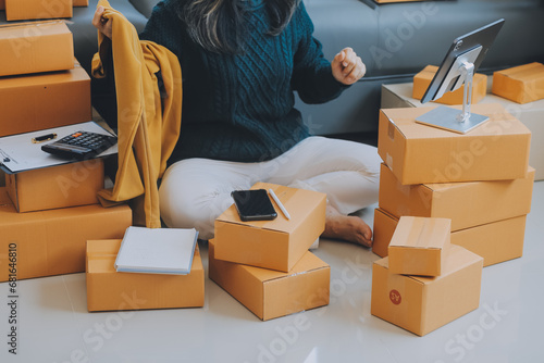Startup SME small business entrepreneur of freelance Asian woman using a laptop with box Cheerful success Asian woman her hand lifts up online marketing packaging box and delivery SME idea concept