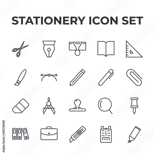 vector, stationery, icon, set, symbol, crayons, office, pen, paper, business, ruler, signs, clip, design, outline, scissors, marker, book, file, pin, cutter, briefcase, illustration, thin, web, folder, paper clip, computer, envelope, colours, eraser, supply, school, stamp, paintbrush, collection, rubber, sharpener, clipboard, pictogram, graphic, binder, education, isolated, work, line, racked, flat, object