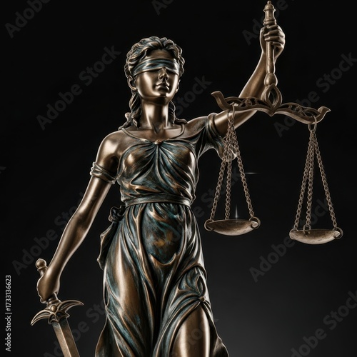 Statue of lady justice holding scales and sword symbolizing fairness and legal proceedings in a dramatic presentation