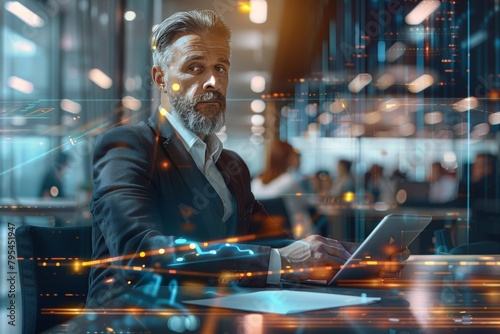 Status adult man in the office at work. Tech background