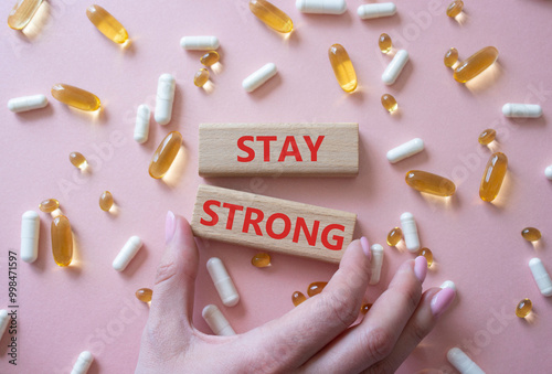 Stay Strong symbol. Concept word Stay Strong on wooden blocks. Beautiful pink background with pills. Doctor Hand. Medicine and Stay Strong concept. Copy space