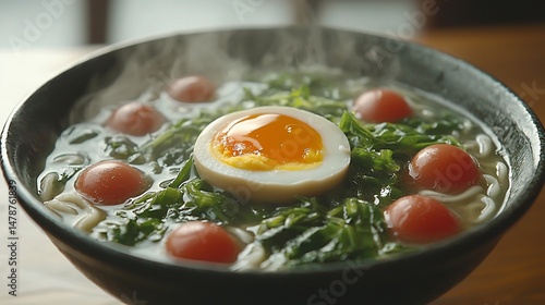ramen, noodle, soup, egg, tomatoes, green, broth, hot, food, asian, japanese, delicious, healthy, meal, bowl, steam, cookery, eatery, comfort, tasty, japanese food, lunch, dinner, vegetarian, vegan, protein, carb, easy, quick, simple, fresh, homemade, receipe, cook, cooking, epicure, food photography