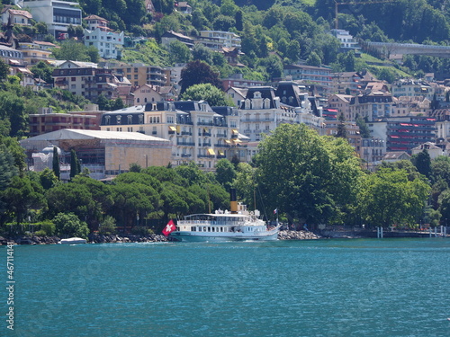 Steamer boat at Lake Geneva and Montreux city in Switzerland