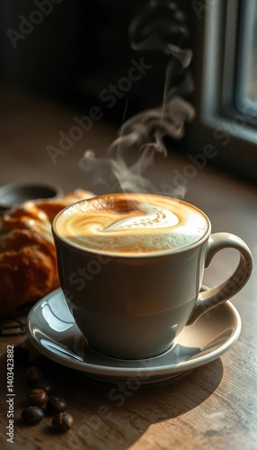 Steaming cappuccino in a ceramic cup beside a golden brioche, Italian, warm