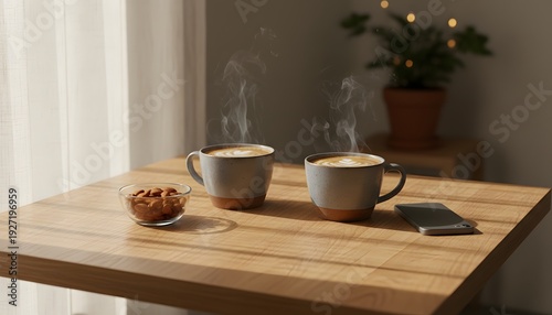 safe, conversation, friends, hot drink, latte, cup, steam, almond, wooden table, connection, friendship, relaxation, cosiness, morning, sunlight, comfort, well-being, between, smartphone, bowl, plant, interior, home, cafes, natural light, warm light, soft light, communicating, chatting, gathering, sharing, togetherness, calmness, peace, trust, support, bonding, human relationships, break, leisure, lifestyle, authentic, empathy, minimalist, inviting, atmospheric, no people, still life
