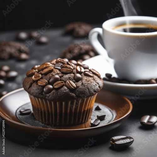 Steaming cup of coffee with a chocolate muffin and coffee beans on a brown saucer, AI generated