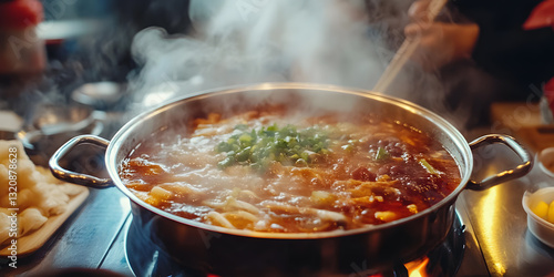 Steaming Hot - Pot with Vivid Colors and Aromatic Toppings: Close - up for Food Promotion, Restaurant Menu or Social Media Food Posts