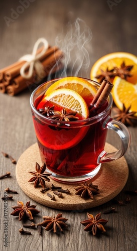 steaming mulled wine with orange slices and spices creating cozy ambiance on wooden table