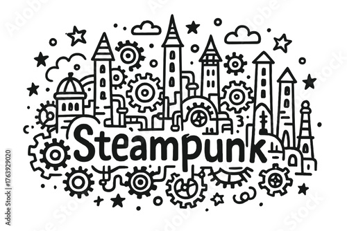 Steampunk Cityscape Doodle. Doodle steampunk city with stars, gears, and towers, center word “Steampunk” in black and white