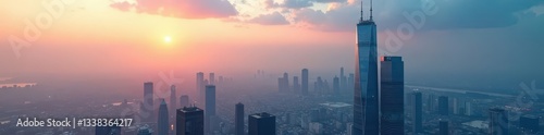 Steel and glass skyscrapers pierce a hazy sky , buildings, glass, city life