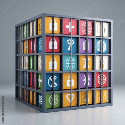 steel cage encases colorful icons representing global trade, symbolizing tariff barriers and economic restrictions