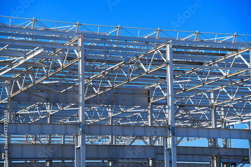 frame, structure, metal, roof, factory, construction, steel, industrial, architecture, modern, industry, technology, workshop, design, site, blue, material, exterior, project, building, business, framework, steelwork, truss, estate, sky, girder, house, iron