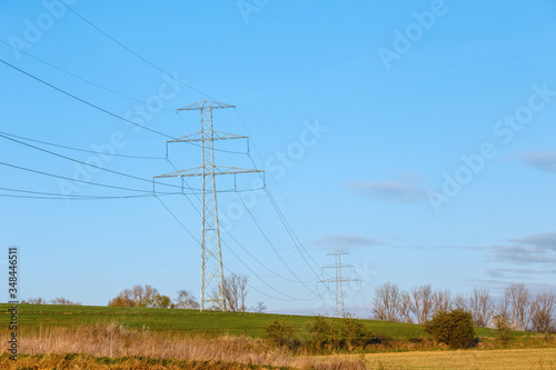 Steel high voltage poles and electric wire with blue sky and fields in rural areas.