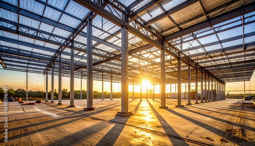 Steel Structure Construction Industrial Building Framework at Sunset - Modern Architecture Design