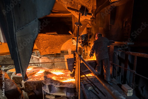 people, man, steelworker, furnace, industry, industrial, steel, iron, metal, liquid, tank, ladle, manufacturing, manufacture, interior, person, men at work, ferric, slag, working, work, danger, dangerous, pouring, fire, burn, burning, flames, light, spark, orange, heat, hot, foundry, molten, refractory, plant, factory, metallurgy, metallurgical, equipment, production, workshop