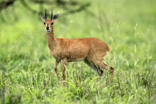 Steenbok (Raphicerus campestris), adult, male, foraging, vigilant, dwarf antelope, Kruger, Kruger National Park, South Africa
