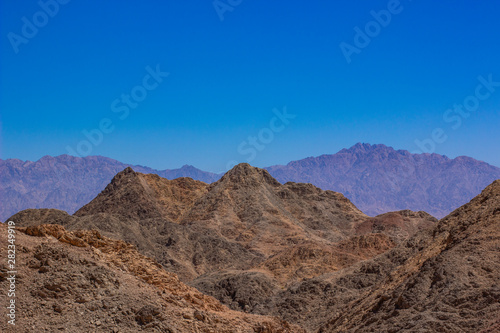steep and sharp rocky mountain desert wilderness scenery landscape wallpaper pattern picture with empty blue sky background and space for copy or text