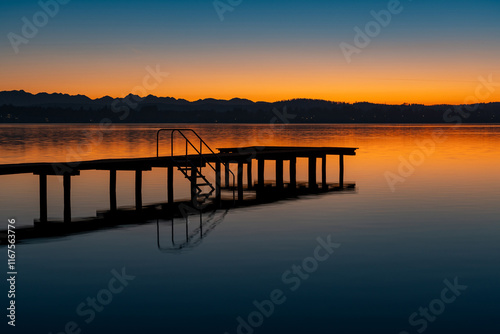 sunset, evening, sunset, dusk, sunset, evening scene, light, sun, water, see, body of water, bridge, bridge, countryside, idyl, silhouette, heaven, bavaria, romantic, romantic, idylli, reflex, nature, dock, blue, orange, yellow, horizon, black, winter, staircase, mount, mountain, bavarian, bavarian, shore, recreation, ease