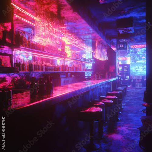 Step into a neon cyberpunk bar where digital decay meets glitchy textures, creating an immersive atmosphere of futuristic nightlife.