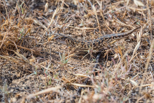 Steppe Runner Lizard or Eremias arguta in dry grass close