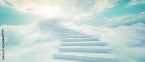Steps climb towards a glowing sky enveloped in soft clouds, representing dreams and endless possibilities.