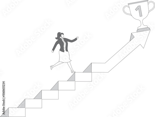 Steps to Success, A businesswoman climbing up the growing chart steps and achieving her goals