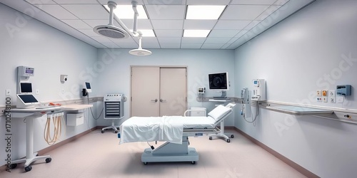 Sterile hospital room, gleaming equipment, empty bed, health, white