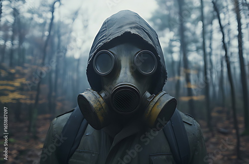 gas-mask, person, hood, gaze, stern, sombre, forest, mysterious, survival, apocalyptic, environmental, protection, danger, pollution, wilderness, eerie, solitude, crisis, threat, abandoned, mask, gas, safety, war, toxic, chemical, respirator, nuclear, woman, protective, military, disaster, fear, people, ecology, apocalypse, concept, air, equipment