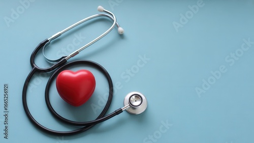 Stethoscope and red heart on blue background representing healthcare, cardiology, and medical concepts for wellness and treatment
