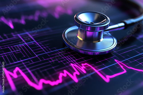 Stethoscope on colorful ECG monitor showing heartbeat data.