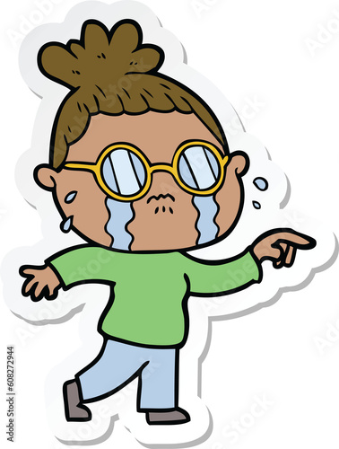 sticker of a cartoon crying woman wearing spectacles