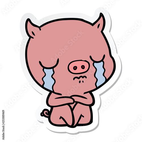 sticker of a cartoon sitting pig crying